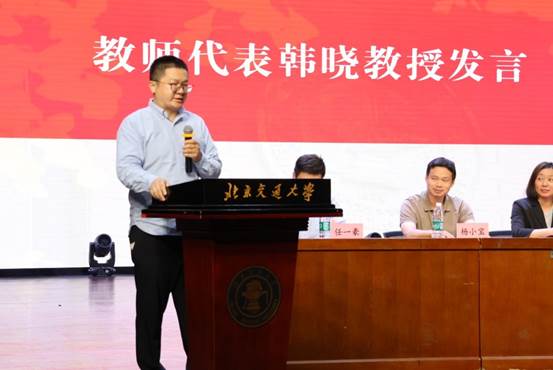 学院教师代表韩晓教授结合自己多年来的学习、科研和教学经历,鼓励新生要努力适应新阶段,及早树立个人目标,持之以恒扎实学习专业知识,积极利用学院平台拓展视野、提升能力。