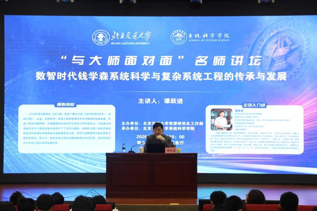 2026年3月27日上午,由北京交通大学党委研究生工作部主办,系统科学学院承办的“与大师面对面”名师讲坛在第九教学楼中心报告厅成功举办。本次活动邀请到国防科技大学系统工程学院教授、博士生导师、专业技术少将谭跃进,以“数智时代钱学森系统科学与复杂系统工程的传承与发展”为主题,为师生带来了一场学术盛宴。系统科学学院全体班子成员,在校教师以及近400名本研学生参加活动。